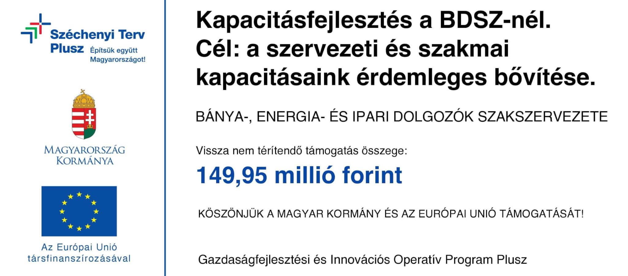 A projekt célja a Bánya-, Energia- és Ipari Dolgozók Szakszervezete (BDSZ), mint szociális párbeszédben résztvevő szervezet szervezeti és szakmai kapacitásának megerősítése és fejlesztése. A projekt tevékenységeinek eredményeként a szervezet hatékonyan és felkészülten tudja képviselni a bánya-, energia- és könnyűipari munkavállalók, valamint az alapszervezetek érdekeit. A GINOP_PLUSZ-3.2.3-24-2024-00058 azonosító számú nyertes pályázat a Széchenyi Terv Plusz program keretében 36 hónap alatt valósul meg 149,95 millió forint vissza nem térítendő európai uniós támogatás segítségével.